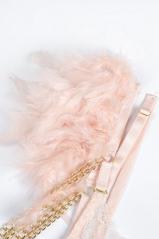 Get that luxury and very sexy look with our Exotic Chic Feather Lingerie Set. Features Feathers and a beautiful light pink appearance.