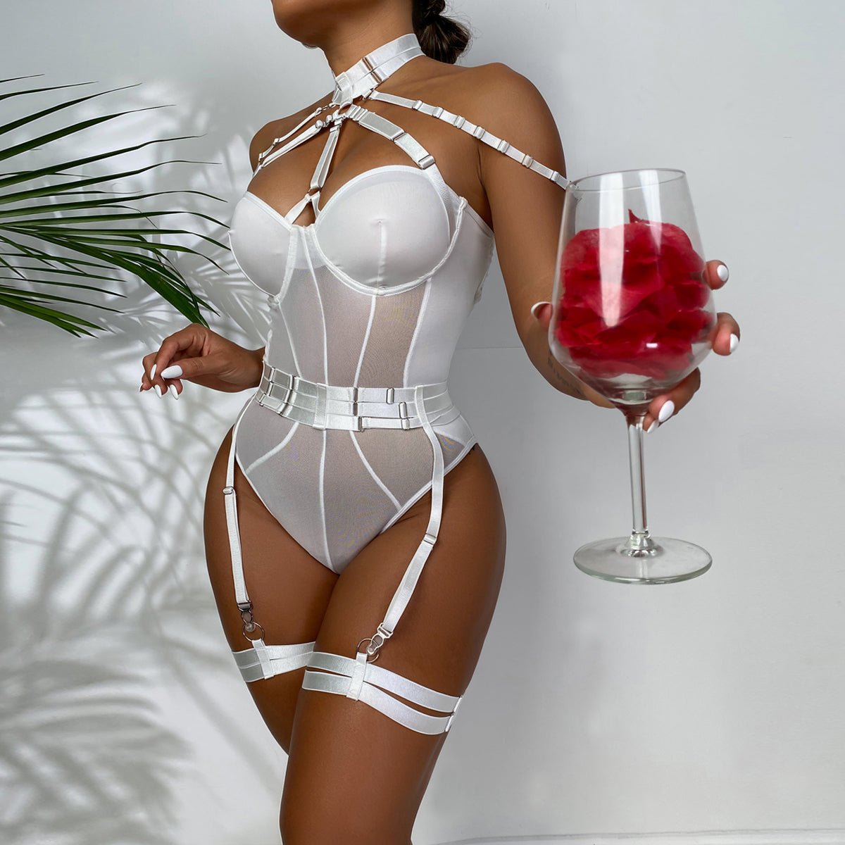 Make a splash in this lingerie that looks like a femme fatale. From its slight transparency to its chains, this bodysuit will quickly raise the temperature.