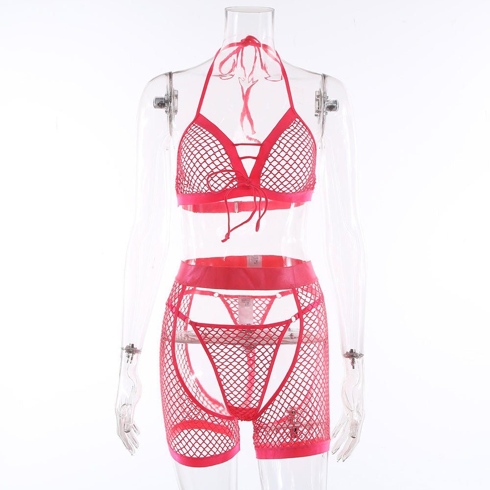 This elegant lingerie set is made of lightweight, breathable, and comfortable material. The hollow-out design makes the outfit lighter and easier to move in. The neon pink color will look great with any skin tone.
