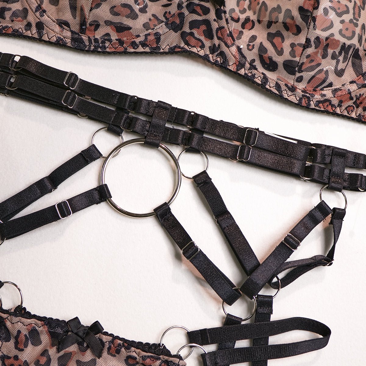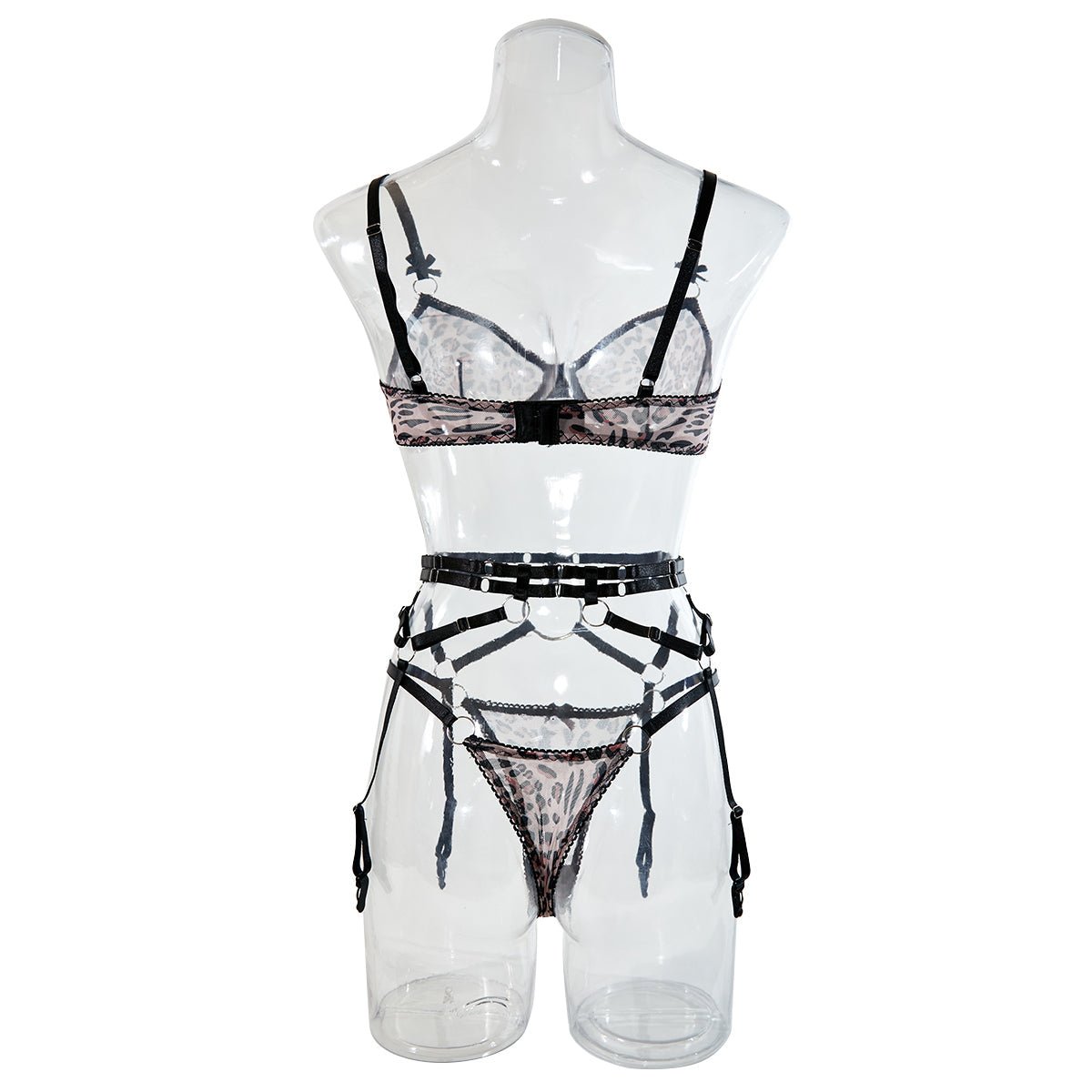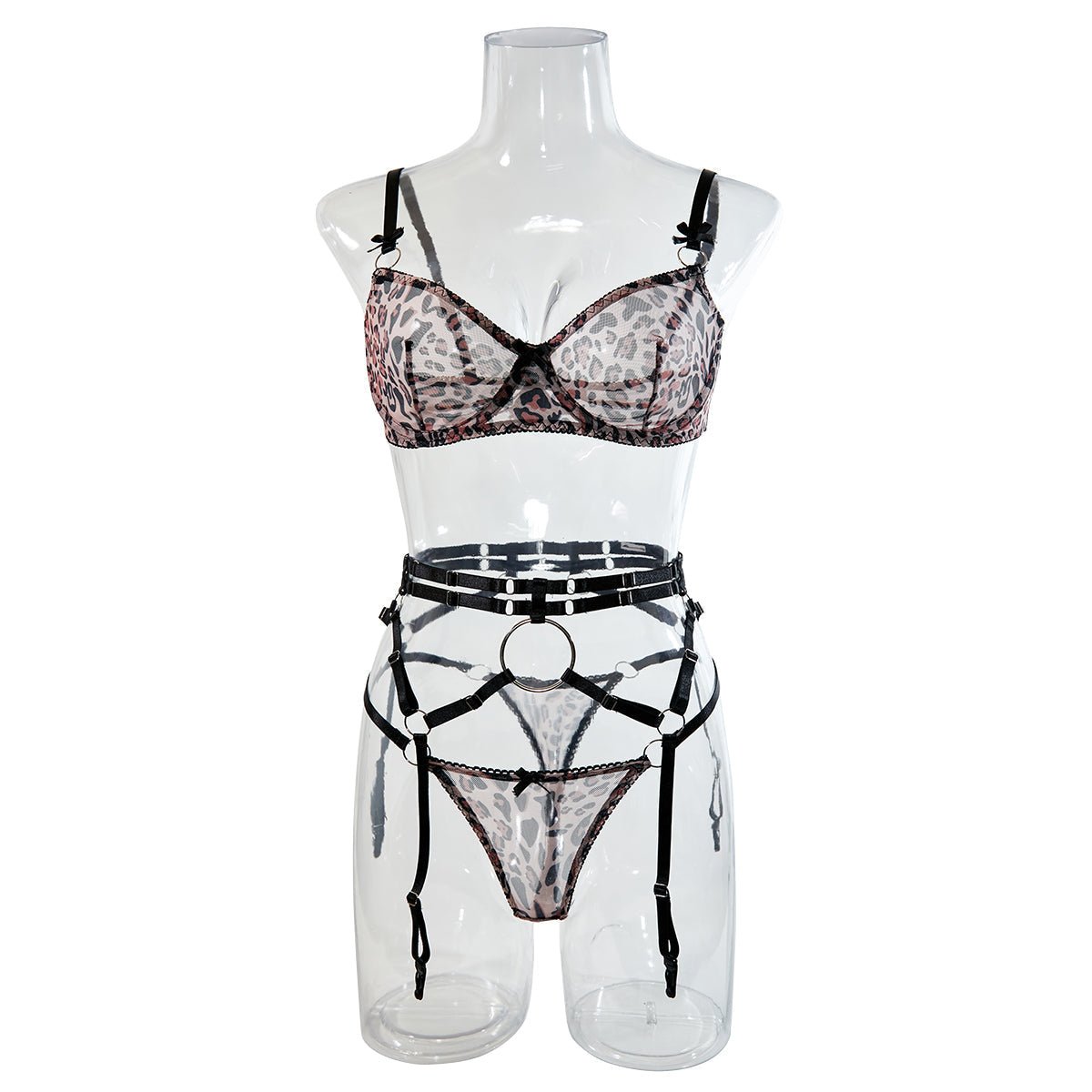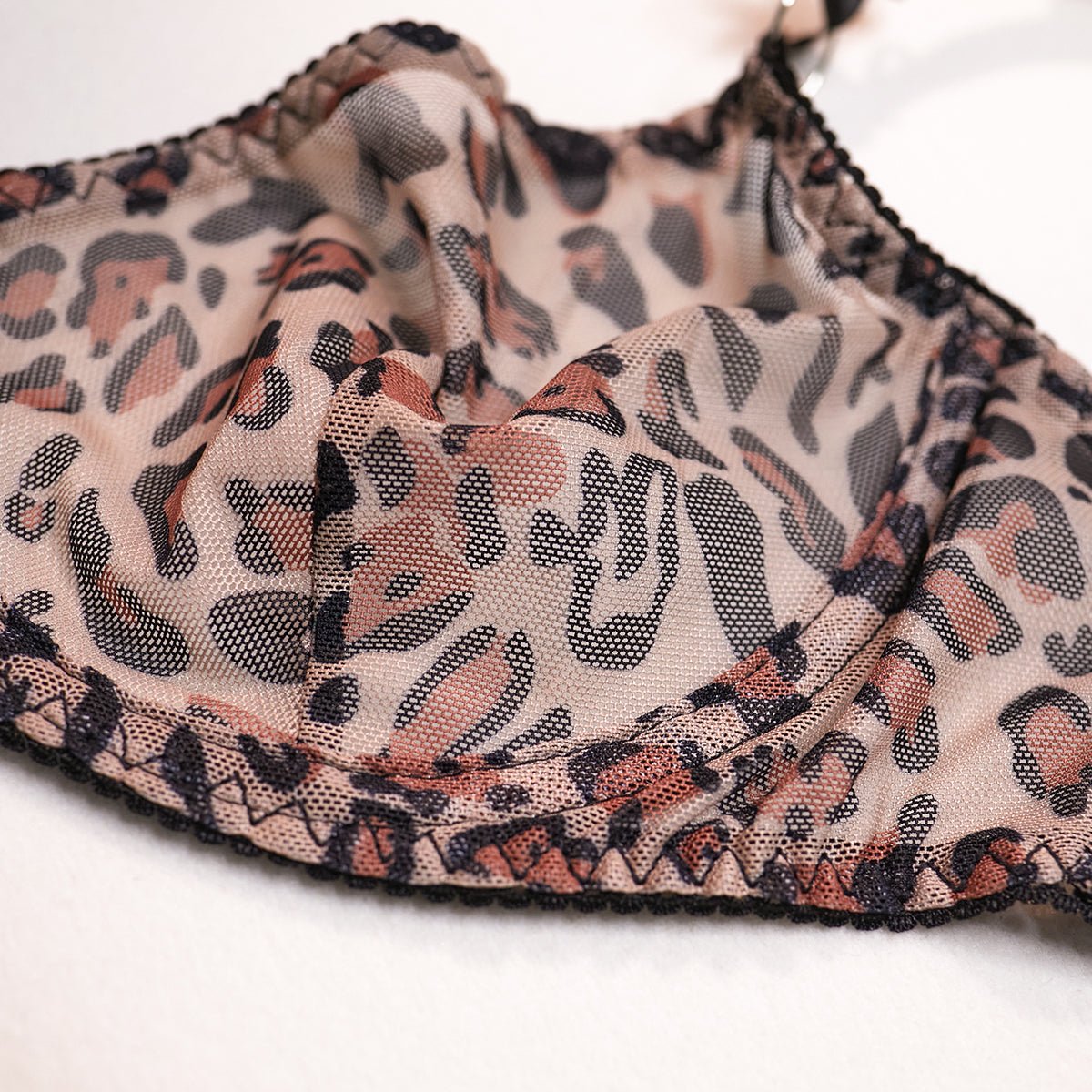 Naughty and nice lingerie set. This set includes a bra with back closure and matching panty. The bra is made of lace and the panty is made of linen. The set has a leopard print decoration on the front.